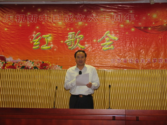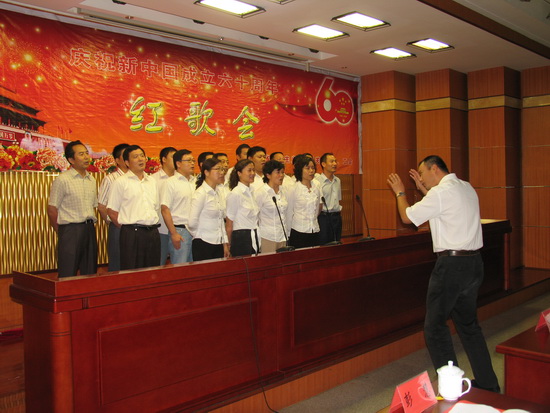 用喜悦的歌声迎接新中国成立60周年,用自豪的歌声赞颂新中国成立60周年。9月30日上午,我院举行庆祝新中国成立60周年";爱国歌曲大家唱";红歌会。省委统战部副部长、院党组书记、副院长周和平出席并致辞,院领导唐旭明、黎玉林、彭慧及全院干部职工参加了红歌会。 周和平在致辞中说,新中国成立的60年,是中国共产党带领全国各族人民为实现国家繁荣富强、人民幸福富裕不懈奋斗的60年,是我国社会主义经济建设、政治建设、文化建设、社会建设以及生态文明建设和党的建设取得辉煌成就的60年。60年来,我国社会发生了历史性巨变,综合国力大幅跃升,人民生活明显改善,国际地位显著提高,社会主义民主政治在不断探索前行,人民代表大会制度、中国共产党领导的多党合作和政治协商制度不断完善,在中国的政治生活和社会生活中发挥了重大的作用。我们为60年取得的辉煌成就感到无比骄傲,对伟大祖国更加充满挚爱! 他说,我院恢复办学以来,在省委的正确领导下,在省委统战部的指导和有关部门的支持下,坚持围绕中心、服务大局,以制度建设为保证,以改革创新为动力,着力提高为科学发展服务、为统战工作服务、为广大学员服务的能力,制度建设、教学科研水平、文化学院工作、基本建设、管理保障等都有了新的发展,办学质量和办学水平得到提升。当前,我院正处在新的发展的关键时期,要牢固树立机遇意识和忧患意识,内强素质,外抓机遇,乘势而上,加快发展,逐步形成具有我院特色的教学、科研、管理等新的工作模式。他要求,全院上下要联系实际,用十七届四中全会精神指导各项工作,不断推进我院的科学发展、和谐发展。 周和平最后代表院党组和院领导班子,祝全院干部职工、退休老同志节日愉快,阖家欢乐! ";党啊,你赤胆忠心为人民,领导人民奔小康,";一句满怀真情的表达,是我院全体干部职工由衷的心声。一曲饱含深情的《没有共产党,就没有新中国》拉开了我院庆祝新中国成立60周年";爱国歌曲大家唱";演唱会的序幕。 随后,各处室分别演唱了《游击队歌》、《我的中国心》、《团结就是力量》、《走在大路上》等歌曲。大家用最饱满的精神、最真挚的热情唱响了共产党好、社会主义好、改革开放好、伟大祖国好、各族人民好,用歌声大力弘扬爱国主义、集体主义、社会主义的崇高精神,表达了我院干部职工对伟大祖国的热爱,对祖国母亲的美好的祝福。同时充分展示了我院干部职工昂扬向上的精神状态,进一步激发了大家的民族自尊心和自豪感。 最后,全场深情合唱《歌唱祖国》把红歌会推向了高潮。
