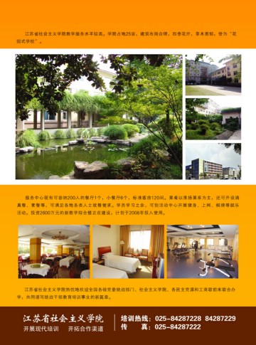 江苏省社会主义学院是中共江省委创办的具有统一战线性质的政治学院,是各民主党派、无党派人士的联合党校。创办于1956年,1988年复校。现座落于十朝都会的南京城东,毗邻风景秀丽的东郊风景区,院内环境优美,设施优良,是党外人士和统战干部学习培训的理想场所