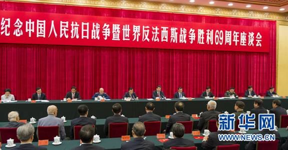 新华网北京9月3日电 中共中央、国务院、中央军委3日下午在人民大会堂举行座谈会,纪念中国人民抗日战争暨世界反法西斯战争胜利69周年。