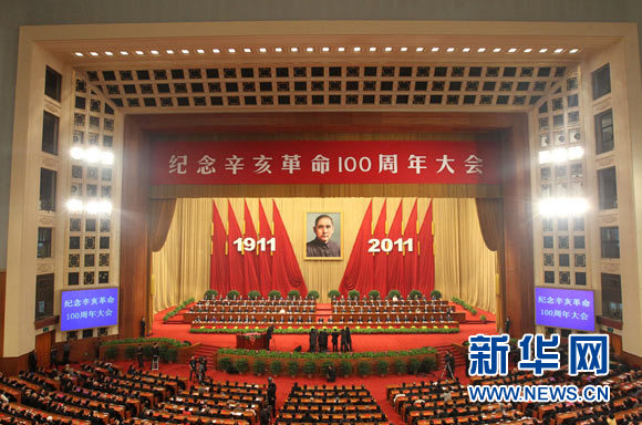 人民大会堂大礼堂主席台台口上方悬挂着";纪念辛亥革命100周年大会";会标,后幕正中是孙中山先生的巨幅画像,十面鲜艳的红旗分列两侧,上面悬挂的";1911";";2011";字标格外醒目。