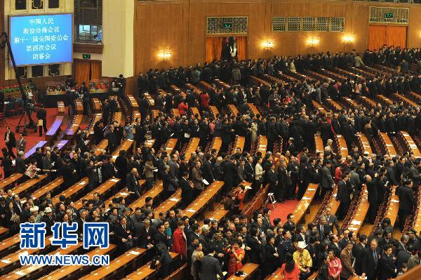 新华社北京3月13日电 中国人民政治协商会议第十一届全国委员会第四次会议圆满完成各项议程后,13日上午在人民大会堂闭幕?;嵋楹耪?,人民政协的各级组织、各参加单位和广大政协委员,紧密团结在以胡锦涛同志为总书记的中共中央周围,高举中国特色社会主义伟大旗帜,以邓小平理论和";三个代表";重要思想为指导,深入贯彻落实科学发展观,以昂扬向上的进取精神、求真务实的工作态度,凝心聚力、共谋发展,为实现";十二五";时期目标任务、夺取全面建设小康社会新胜利而努力奋斗。