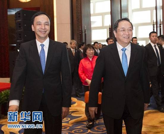这是俞正声与朱立伦共同步入会场。新华社记者 王晔 摄