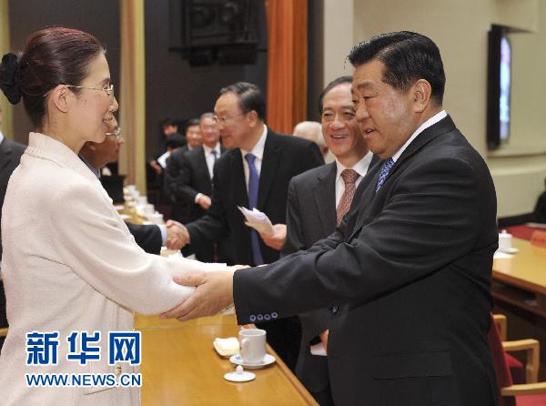 12月13日,“身边的榜样――树立和践行社会主义核心价值体系先进人物事迹报告会”在北京人民大会堂举行。中共中央政治局常委、全国政协主席贾庆林出席会议并讲话。这是贾庆林等会前与先进人物合影。新华社记者黄敬文摄