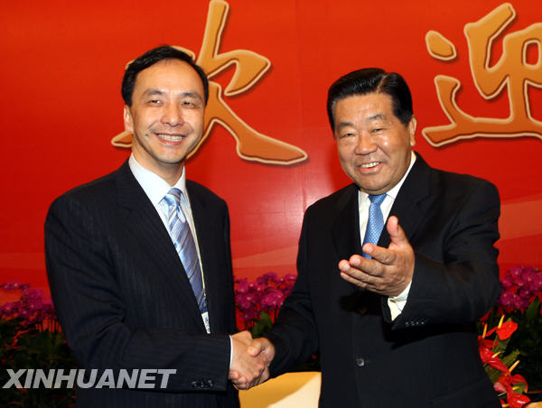 5月16日,中共中央政治局常委、全国政协主席贾庆林在厦门海峡会议中心会见出席首届海峡论坛的两岸各界人士。这是贾庆林与中国国民党副主席、桃园县县长朱立伦握手。