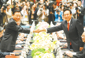 4月26日上午,海峡两岸关系协会会长陈云林与台湾海峡交流基金会董事长江丙坤在南京举行会谈。这是两会恢复协商后领导人第三次会谈。