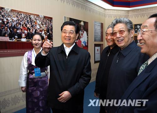3月27日,中共中央总书记、国家主席、中央军委主席胡锦涛在北京民族文化宫参观“西藏民主改革50年大型展览”。