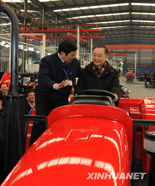 ?。保叭?,温家宝继续在常州和南京市的企业调查研究。在国家扩内需、保增长的政策拉动下,农机企业出现了快速发展的好势头。常州常发集团就是一家这样的企业。温家宝在生产车间考察了四轮拖拉机、插秧机等产品的生产和销售情况。企业负责人说,现在国家有三条扶持政策,一是增值税转型,二是提高出口退税率,三是对农民购买农业机械给予补贴。这些政策对农机企业发展促进很大。我们的日子比过去更好过了。温家宝说:“你们要利用好这个机遇,开发出适合农民需要的农业机械。中国是世界上农民最多的国家,应该生产出世界最好的农业机械。我希望在你们这个厂子里就能实现这个目标?!痹诔〉墓と嗣谴笊卮鸬溃骸白芾砬敕判?,我们有信心!”