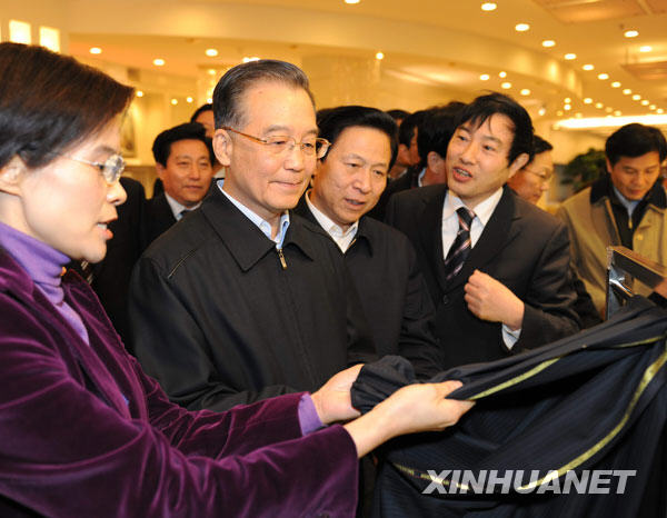 这是1月9日温家宝在阳光股份有限公司查看布料的质量,鼓励企业开拓市场,走向世界。