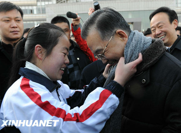 这是1月10日温家宝来到常州高等职业教育园信息学院看望师生时,一位学生把一条自己织的围巾给总理围上。