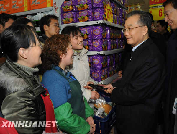 这是1月10日晚温家宝在南京苏果超市了解节日市场供应情况。1月9日至11日,中共中央政治局常委、国务院总理温家宝到江苏省考察工作。
